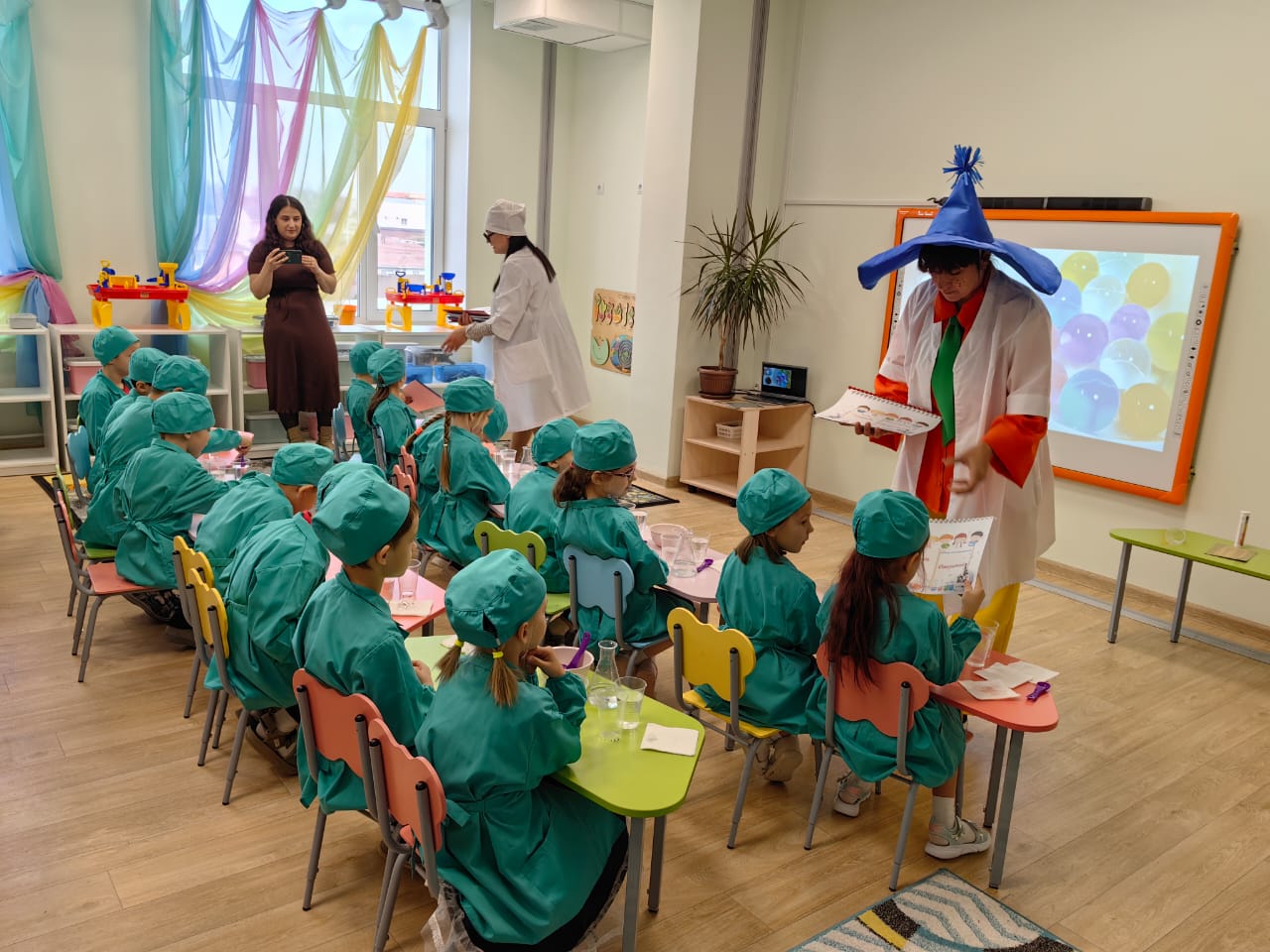 А в лаборатории наших ребят встретила профессор Колбачкина, которая посвятила детей в юные исследователи и провела увлекательные эксперименты с шариками "Орбиз".